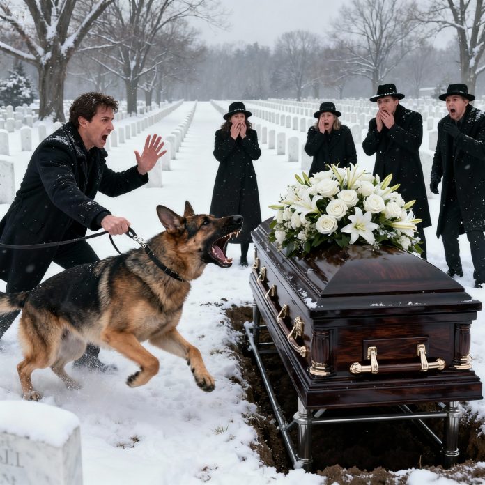 A piercing, desperate clamor erupted from Luna, my father’s German Shepherd, shattering the fragile peace of Patrick’s memorial service. Her posture was rigid, fur bristling, her intense stare fixed on the polished coffin. It wasn’t the mournful cry of a grieving animal; it was an urgent, almost frantic alarm. The congregants exchanged bewildered glances, their hushed murmurs failing to quell the dog’s escalating agitation.