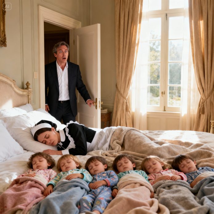Across town, Nora Delgado, twenty-six, a psychology student and cleaner, laced up her worn sneakers. Her past, a house fire that claimed her younger brother, had stripped her of fear. When the agency called with an emergency placement—triple pay—she looked at her tuition bill. “Send me the address.” The Whitaker house was beautiful, but inside, it felt abandoned. The security guard offered a grim “Good luck.” Jonathan, his eyes shadowed, warned her. “Cleaning only. My daughters are grieving. I can’t promise calm.” A crash overhead, followed by sharp laughter, punctuated his words. Nora merely nodded. “I am not afraid of grief.” Six girls watched from the stairs, their faces a tableau of defiance and sorrow. “I am Nora,” she said evenly. “I am here to clean.” Hazel, twelve, stepped forward. “You are number thirty-eight.” Nora smiled, unflustered. “Then I will start with the kitchen.” She noticed the refrigerator photos: Maribel cooking, Maribel in a hospital bed with baby Lena. Grief wasn’t hidden; it lived openly.