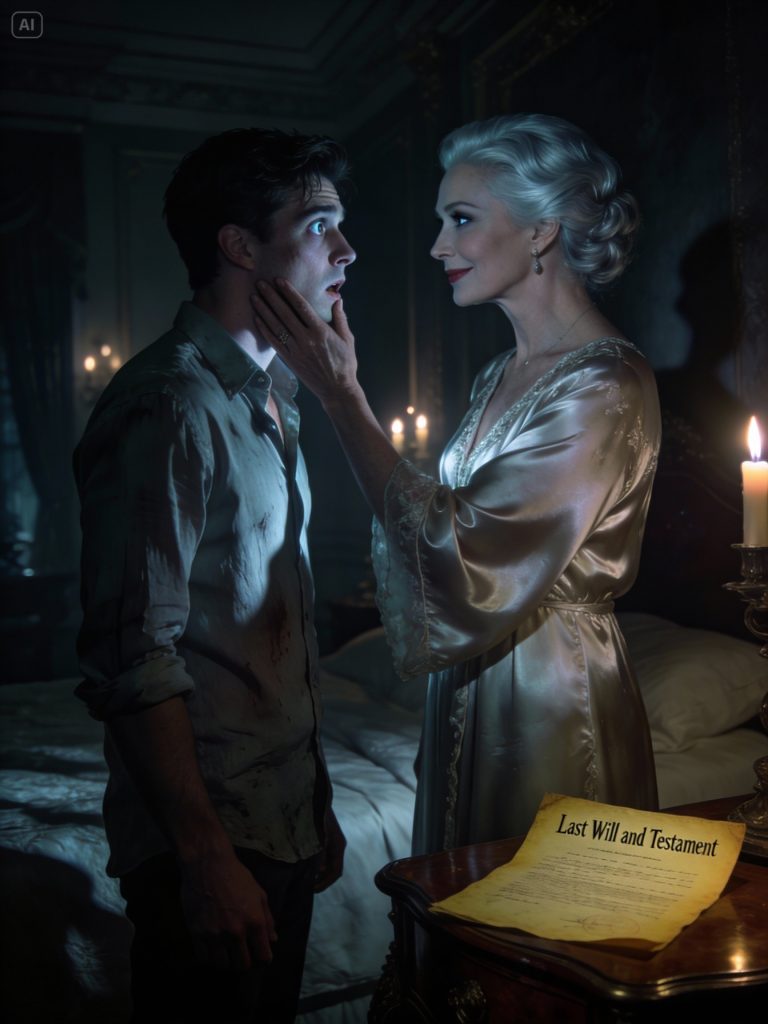 Alex stumbled out of the room, his mind reeling, a profound sense of betrayal crushing him. Love, respect, trust—all shattered into a million pieces. That night, Eleanor entered his room, her smile as serene as ever. “You don’t look well, Alex. Something wrong?” He looked at her—silver-haired, beautiful, terrifying. Only one question echoed in his mind. “Who are you really?” He placed Richard’s old will on the bedside table. Eleanor glanced at it, her eyes closing for a brief, almost imperceptible moment before she smiled faintly. “So you found it.” Her voice was light, airy, yet it carried a chilling resonance that froze his blood. “Good. Now you understand, Alex. Love always comes with power. And in this house, those who know too much… cannot leave.” Alex instinctively stepped back, a primal fear seizing him. She moved closer, her fingers brushing his cheek, a touch that felt like ice. “He told me the same thing,” she whispered, her gaze locking onto his. “And now… I tell you.” A sudden gust of wind extinguished the nearby candle. Darkness enveloped the room. In that moment, Alex realized, with a sickening certainty, that he had become the second man trapped in Eleanor Vance’s deadly, inescapable game.