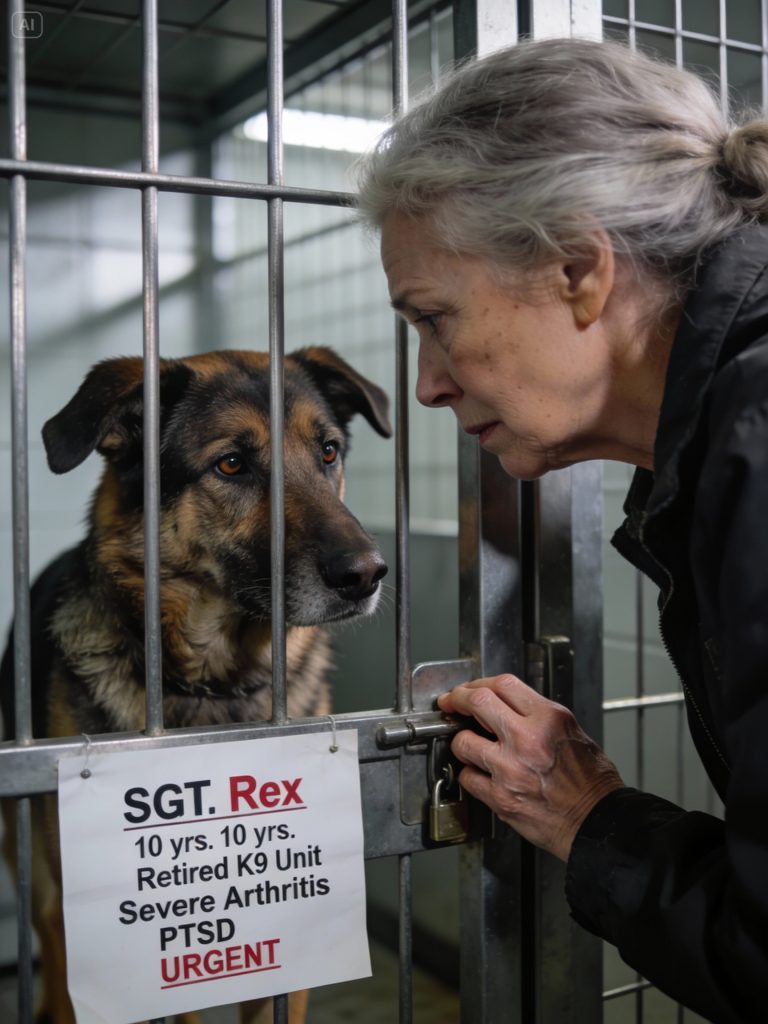 There, behind steel bars, sat a massive German Shepherd. He didn’t bark, didn’t jump, just watched her with calm, dignified eyes. His laminated card read: SGT. REX, 10 years old, Retired K9 Unit, Severe arthritis, PTSD. A red “FINAL NOTICE” sticker screamed across it. “You don’t want that one, ma’am,” a young volunteer cautioned, explaining Rex’s eight years in Narcotics and Search & Rescue, his handler’s divorce, the department’s inability to kennel him. “He’s stiff. He startles easily. And… he’s scheduled for tomorrow morning.” Rex shifted, a tremor of pain in his back leg. He wasn’t asking for mercy, but dignity.