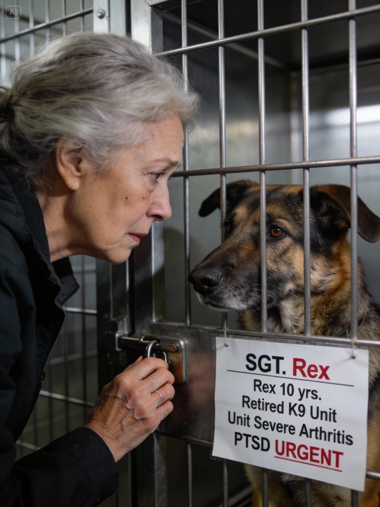There, an imposing German Shepherd sat with stoic grace, his presence commanding despite the confines of his cage. He offered no frantic barks, no desperate leaps, only a steady, watchful gaze, calm and dignified. His file identified him: SGT. REX, age 10, a decorated K9 veteran, retired due to severe arthritis and PTSD. A glaring red “FINAL NOTICE” sticker warned of his impending fate. A youthful volunteer approached, his voice laced with concern. “You might want to reconsider, ma’am,” he advised, detailing Rex’s eight years in Narcotics and Search & Rescue, his handler’s personal circumstances, and the department’s financial inability to house him. “He’s quite stiff. And prone to startling. His time is up tomorrow morning.” Rex shifted, a visible tremor of discomfort traversing his aging frame. His eyes, however, held no plea for clemency, only a silent demand for respect.