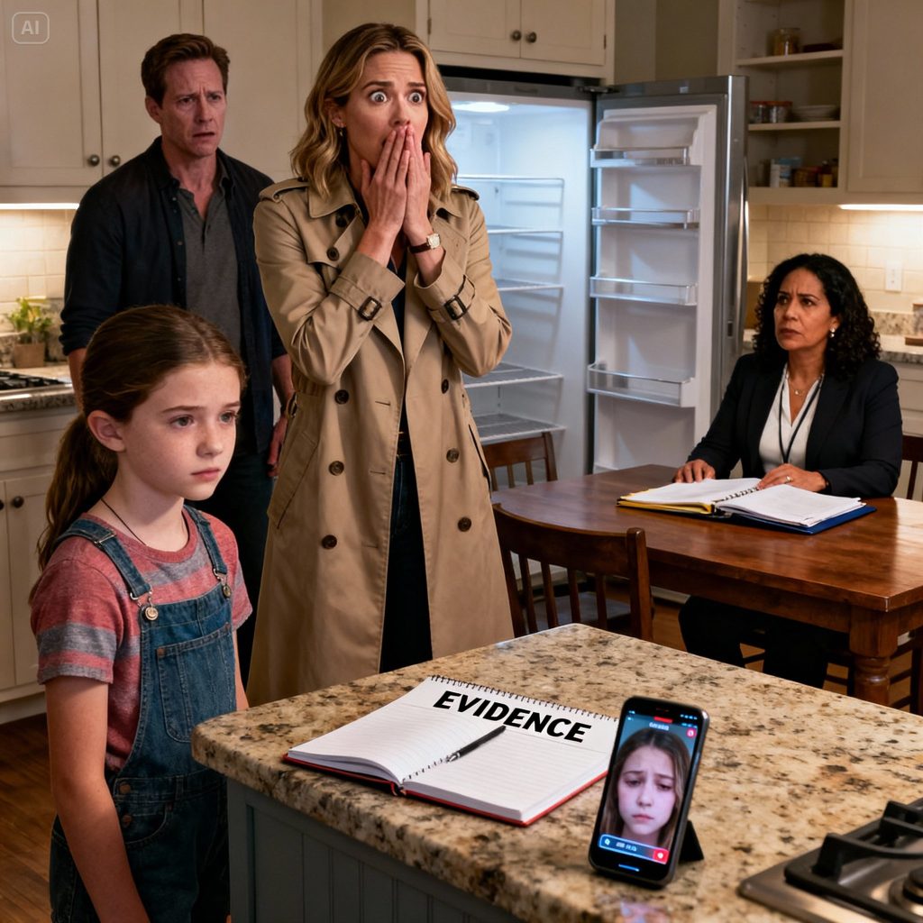 Mr. Harrison stepped into the hall to place his call. Fragments of his hushed, controlled voice reached Chloe: “Alone, eleven, no guardian, no provisions.” She traced “PROOF” in her notebook. It now felt like a legal dossier. Moments later, Mrs. Peterson, her neighbor, arrived, her eyes brimming with concern. “Oh, Chloe, why didn’t you approach me sooner?” she murmured. “Because I didn’t want to appear weak,” Chloe blurted. “They always emphasized my maturity, my ability to handle things. I believed seeking help meant disproving them.” Mrs. Peterson’s expression softened. “Seeking help isn’t weakness. It’s self-preservation. And sometimes it’s the only way to compel adults to confront their actions.” When the caseworker, Ms. Jenkins, arrived, she systematically documented the barren refrigerator, the sparse pantry, the unused credit card. “No one, until today,” Chloe confirmed when asked about supervision. “Not since the airport,” she added, displaying the Paris selfie. “That was it.” Ms. Jenkins nodded, then confirmed Chloe’s temporary placement with Mrs. Peterson. “I wish to reside somewhere I am not overlooked,” Chloe affirmed.