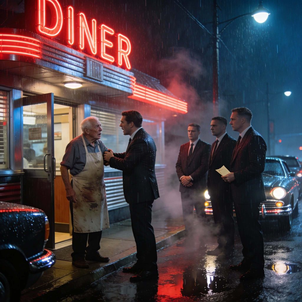 Before Arthur could respond, the diner door slammed open. The landlord stormed in, shouting about demolition crews and deadlines—until he noticed the suits.