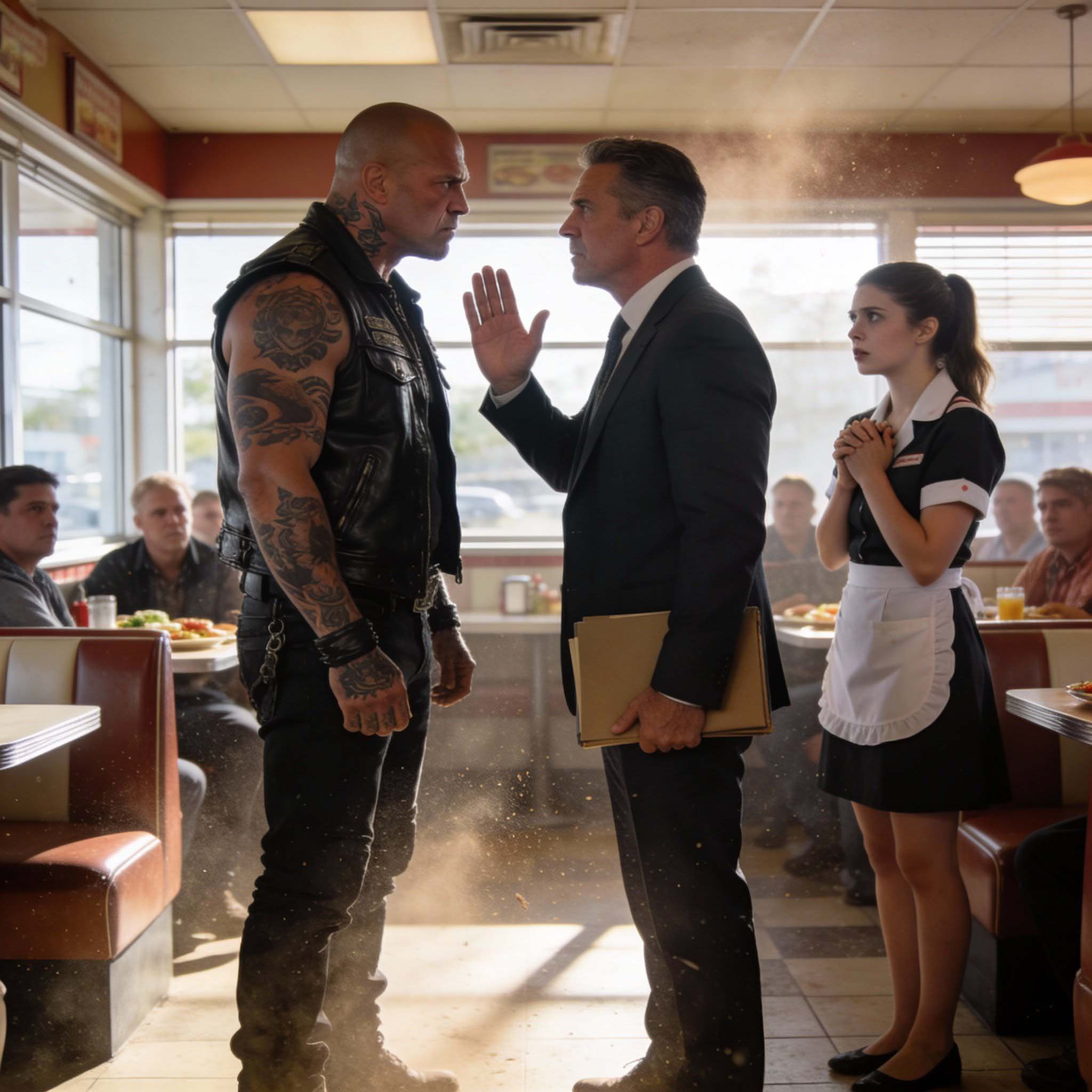 “You’re in a diner,” the biker said evenly. “Not your office. And that’s a human being.”