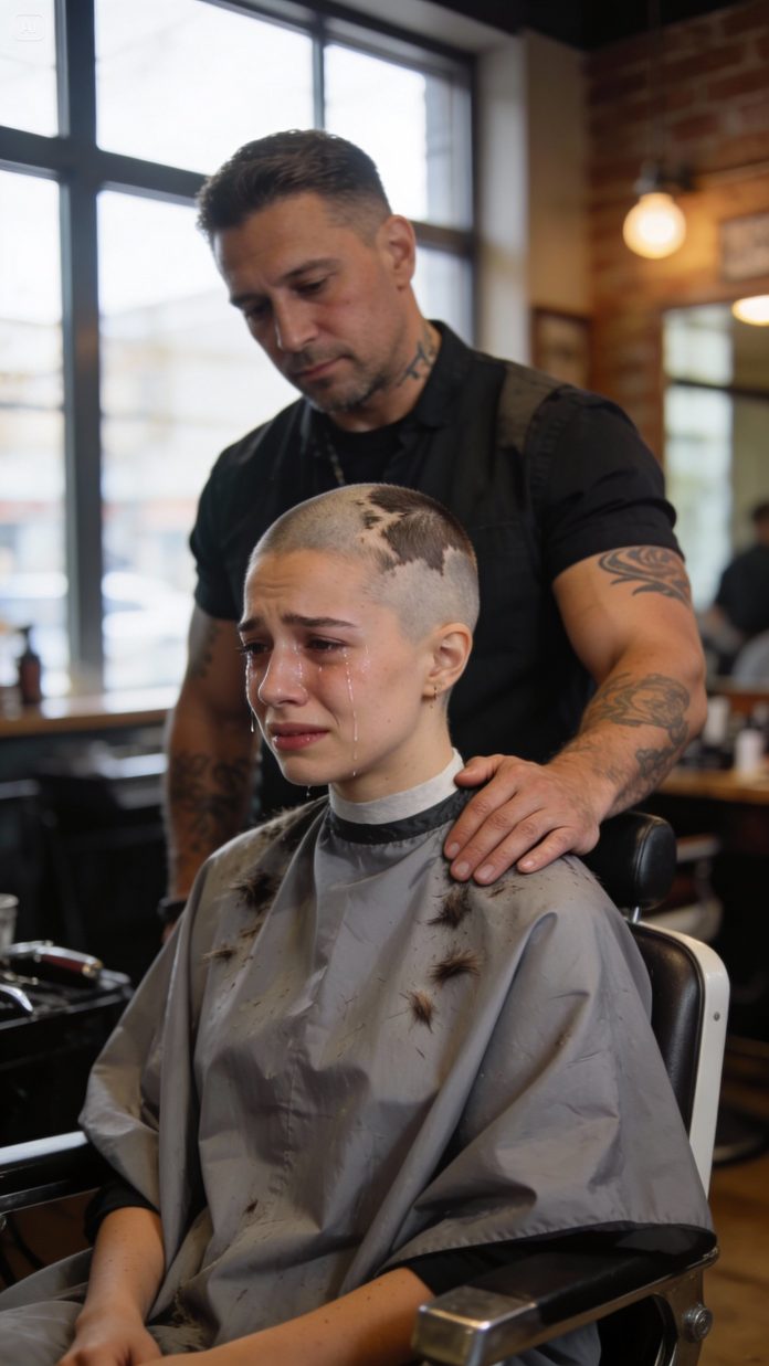 With each pass, more hair disappeared. Her reflection changed in stages—shock, grief, resignation. Tears slid down her cheeks silently. No sobbing. No drama. Just quiet loss unfolding under fluorescent lights.