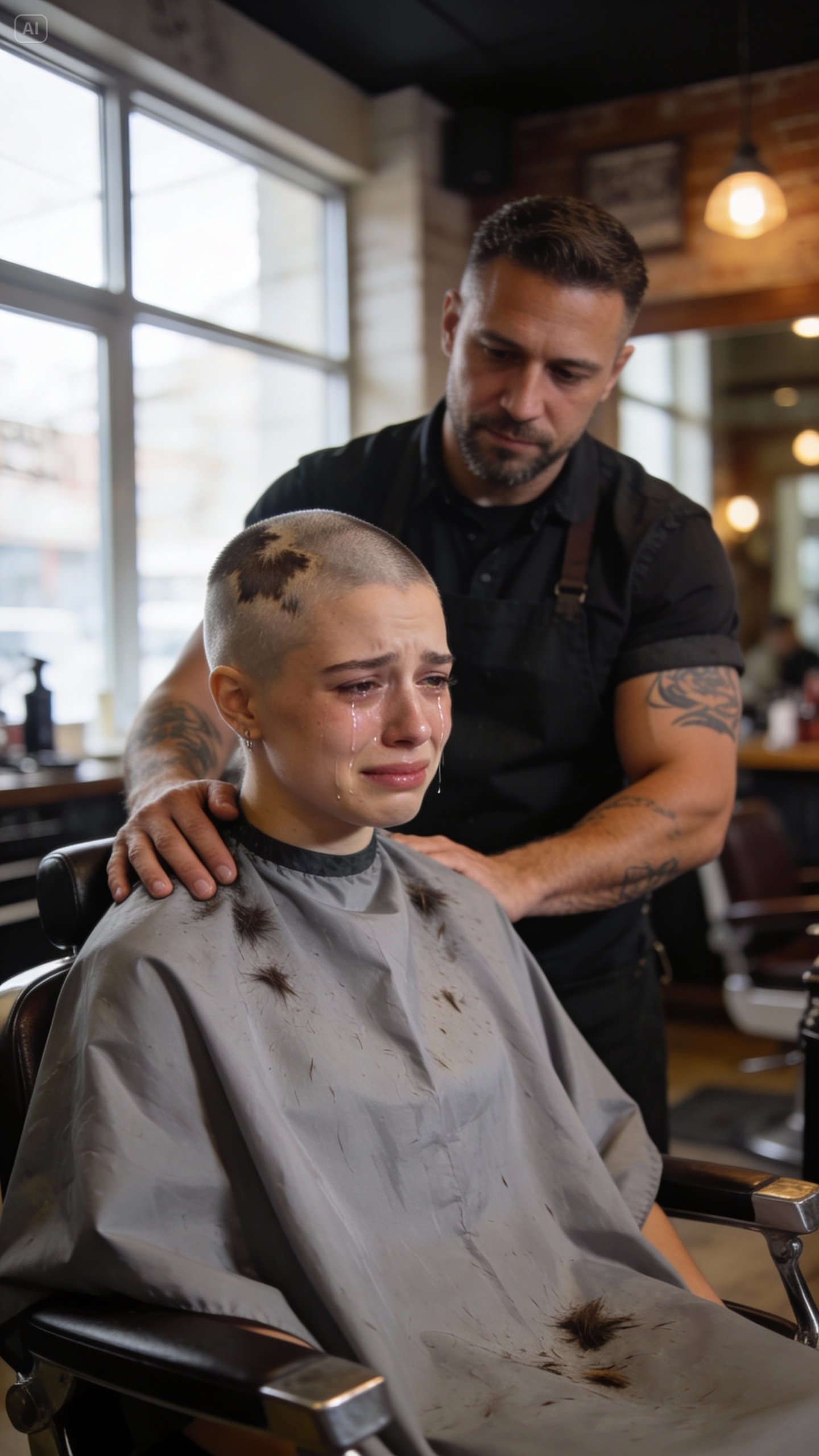 She walked into the barbershop with shaking legs and sat down without removing her coat. The place was ordinary—old chairs, buzzing clippers, men talking about nothing important. Life continuing, indifferent.