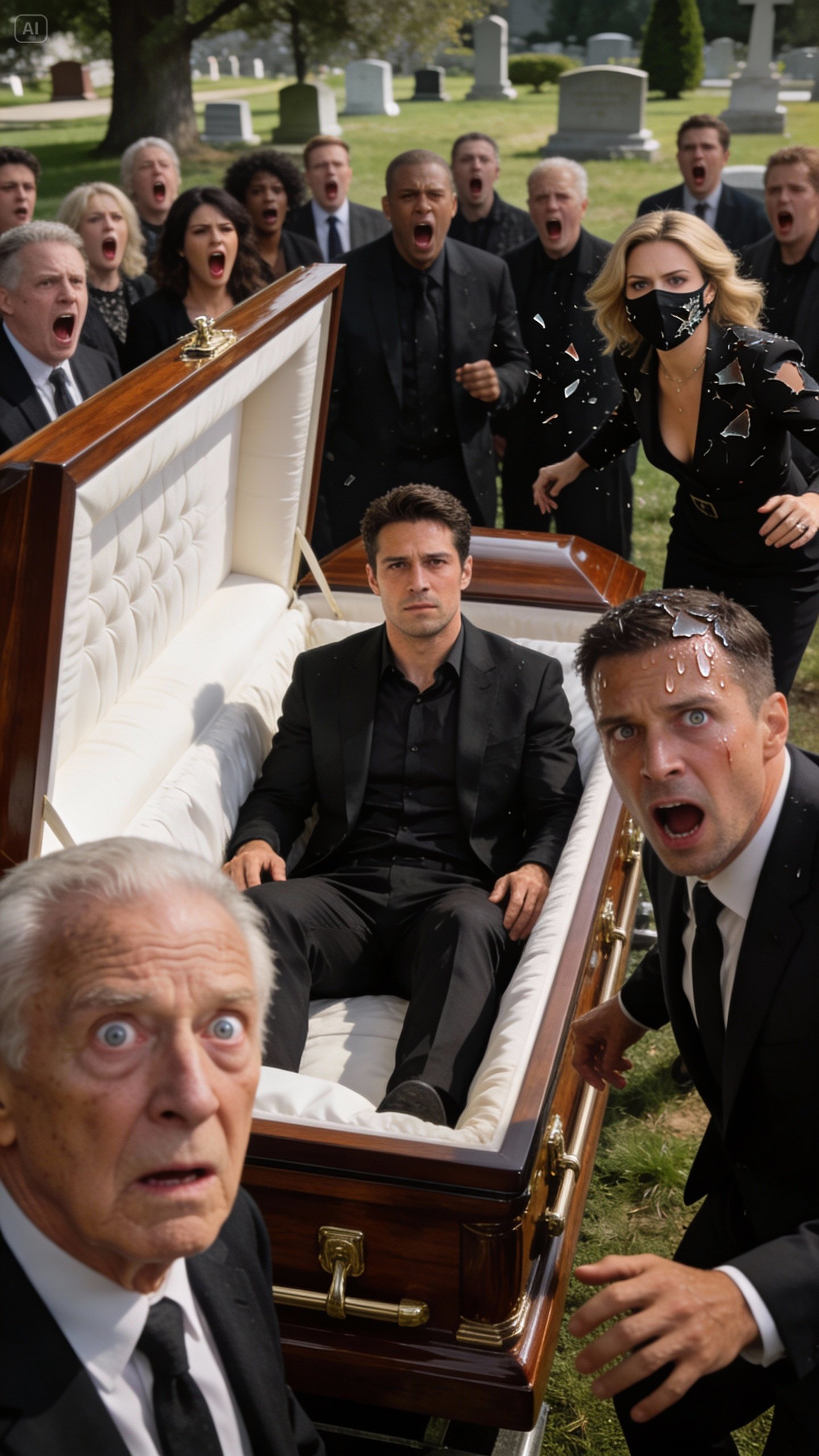 Chaos erupted faster than anyone could control it. Someone screamed. Another person shouted for security. The priest backed away as if the coffin might explode. I didn’t move. I couldn’t. My eyes were locked on the casket as the lid lifted slowly from the inside.