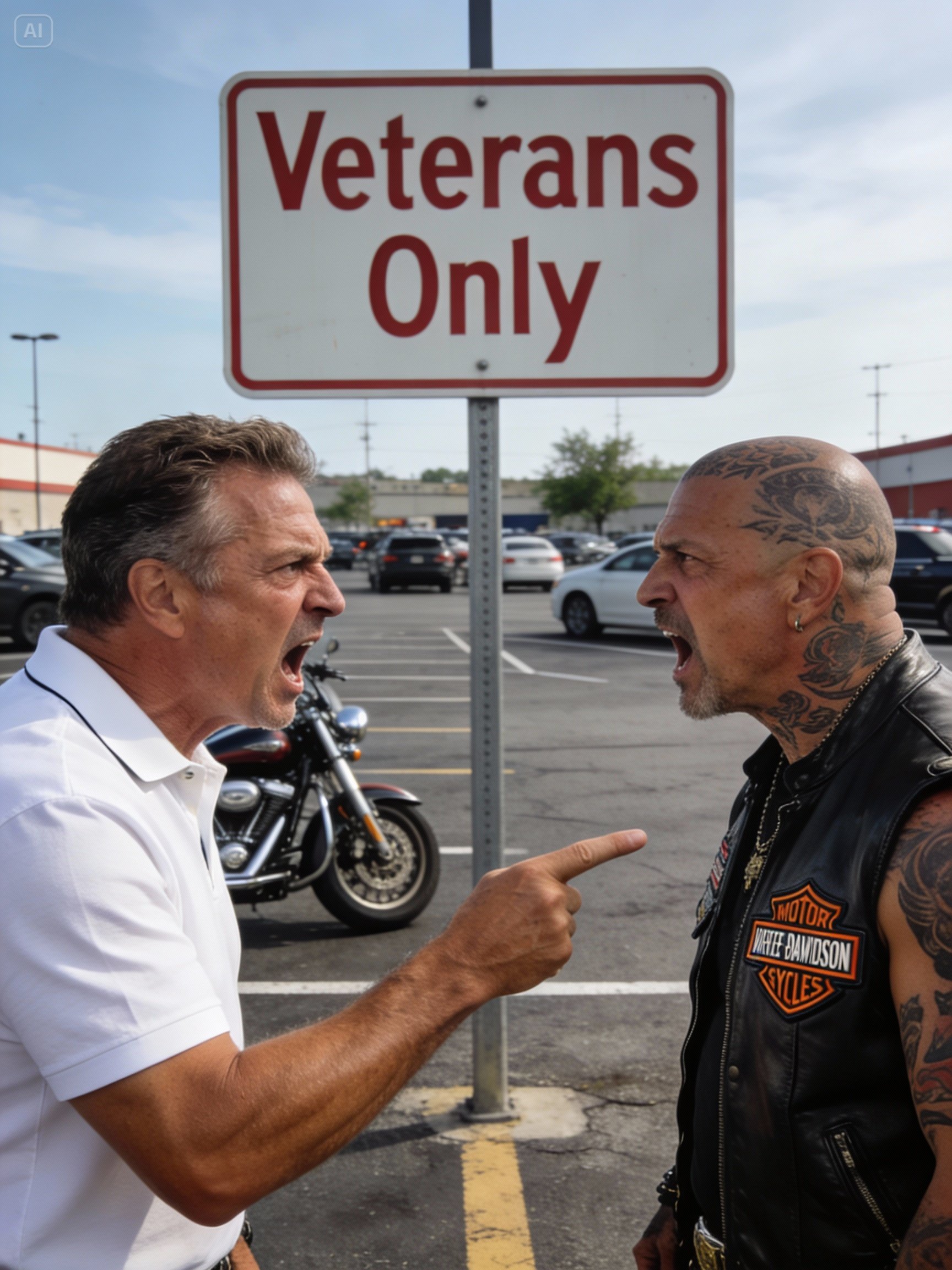 It was a Saturday morning, the kind that turned grocery store parking lots into battlegrounds of carts, honking horns, and impatient people circling for spaces. I had just pulled in when I saw him—an older man easing a battered Harley into the spot marked “Veterans Only.” No special plates. No flag decals. Just a stained leather vest, heavy boots, and a beard that looked like it hadn’t seen scissors in months.