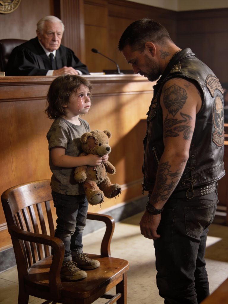 Judge Albright leaned forward, eyes narrowing. “This adoption is denied,” he said, voice cold as winter pavement. “This court will not place a traumatized child with a man like you. Your background, your appearance—this is not suitable.” My shoulders sank. The room blurred for a second. I looked down at my gloved hands, swallowing the taste of defeat. Then the judge turned to Heather with a practiced softness. “You’re safe now, sweetheart. We’ll find you a proper home.” Heather didn’t move at first. Then she stood up—slowly, like standing cost her courage—and climbed onto the witness chair. The whole courtroom held its breath. Her voice came out tiny but steady. “You’re wrong about him.”