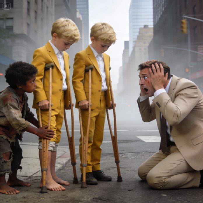 The billionaire’s laughter echoed through the private hospital lobby, sharp and careless, the kind of sound that assumed everyone nearby existed only to witness it. Graham Halden stood near the glass wall, immaculate in a tailored suit, his twin children seated beside him in identical wheelchairs. Their legs were wrapped in sleek orthopedic braces that looked advanced, expensive, and unquestionable. Doctors passed by without stopping. Nurses lowered their eyes. Money had already decided who mattered.