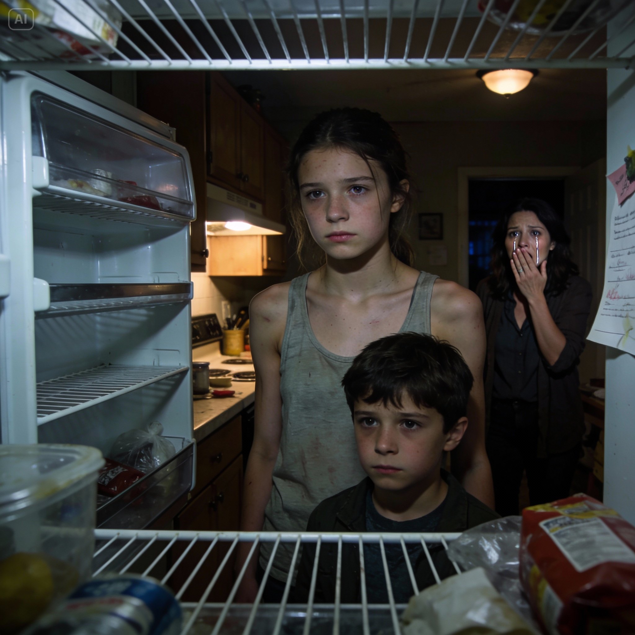 She opened the cabinets. Slowly. Then the refrigerator. The freezer. Her movements became frantic as realization set in.