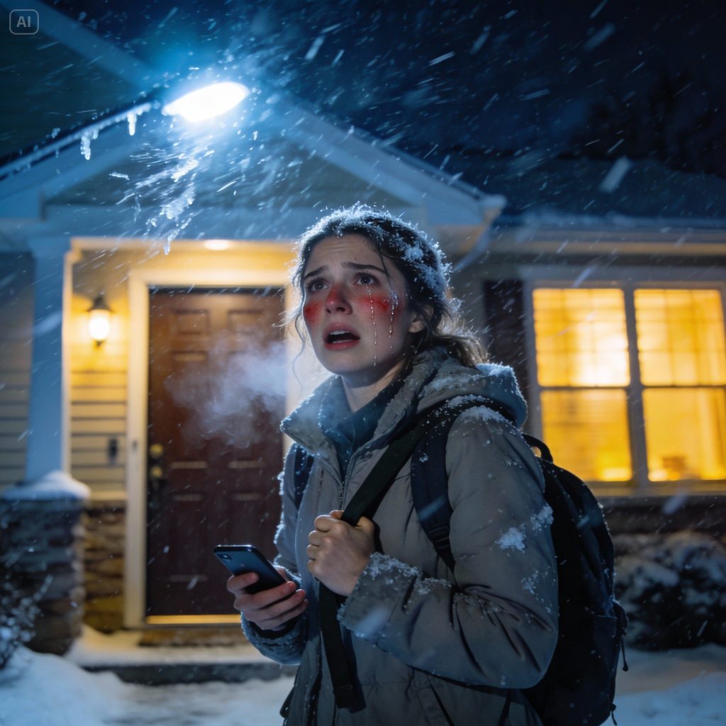 I don’t know how long I kept moving before I realized I was losing track of direction. Houses looked the same—white and gray shapes, yards swallowed, porches half buried. The street sign was coated in ice. My brain started offering terrible ideas, like sitting down “just for a minute” behind a hedgerow to block the wind. I recognized the thought and panicked, because I knew what it meant. That’s how people disappear in storms: they sit down to rest and never stand up again. I forced myself to keep going, but my ankle throbbed and my steps shortened. My hands shook so badly I could barely hold my phone. Then I saw headlights—two soft beams crawling through the snow like something searching. I lifted my arms and waved, but the car passed without stopping, tires hissing on slush. I screamed after it, but the wind stole my voice. My breath came in shallow bursts, and suddenly, I wasn’t sure I could keep my thoughts straight. I imagined Dad inside our house with the heat on, Jenna sipping coffee, Mom scrolling comments. I pictured them telling each other they were “teaching me a lesson.” The cold pressed into my ribs and my spine. My fingers felt like they weren’t part of me anymore. I reached the corner by the small strip mall and leaned against a brick wall, trying to steady myself, but my knees buckled. The world tilted. Snow filled my vision, bright and endless.