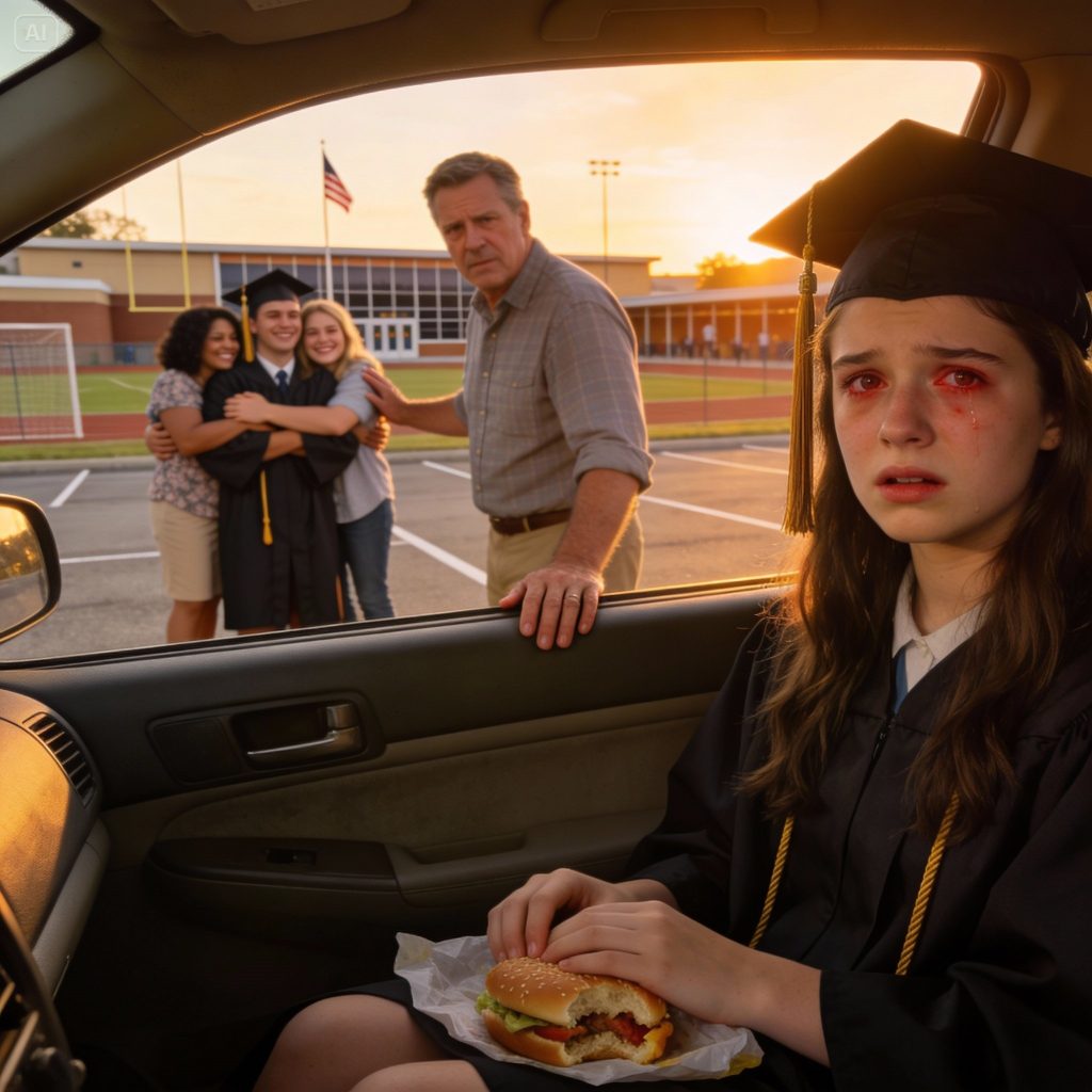 I changed in the locker room, folded my gown, and carried it out like something fragile. Outside, the parking lot shimmered with heat. I sat in my car, still wearing the cap, and stared at the steering wheel until my hands stopped shaking. I drove to the burger place down the road because it was close and because I didn’t trust myself to go home.