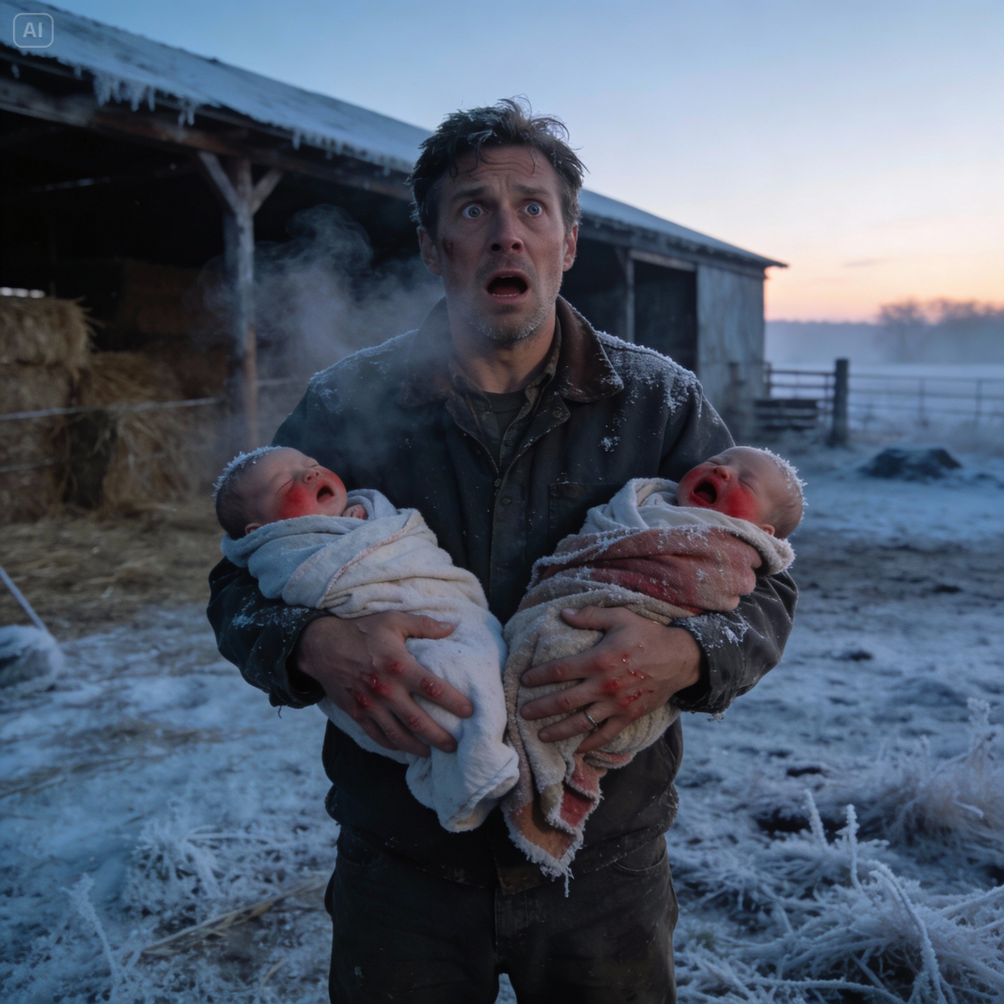 Two newborn babies lay against the barn wall, wrapped poorly in mismatched cloth. Their skin was red from the cold, their movements slow and weak. One barely stirred at all. I dropped to my knees without thinking, lifting them both, pressing them against my chest to share whatever warmth I had left.