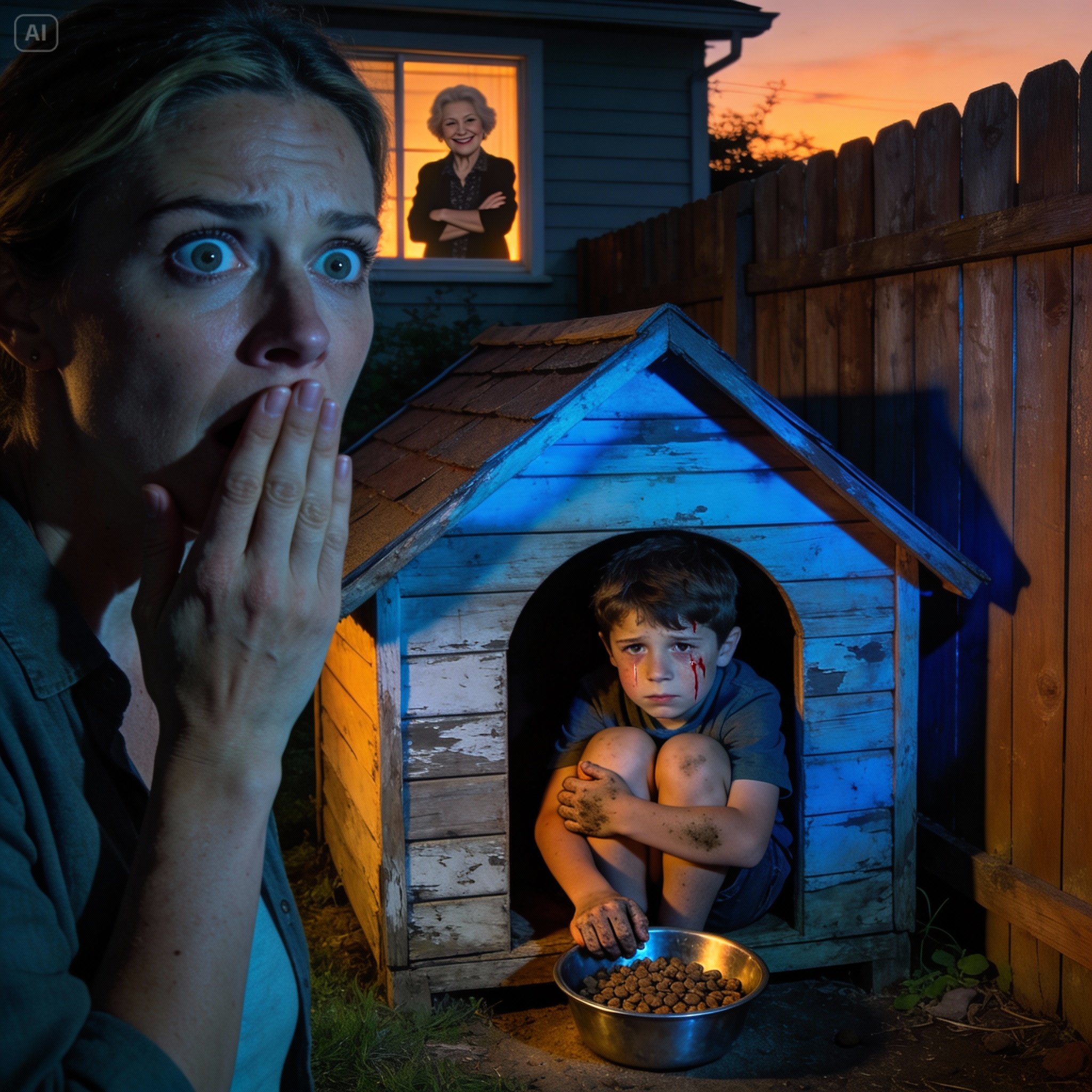 My son, Ethan, was sitting inside the old doghouse we used to store garden tools in. He was crouched low, knees pulled to his chest, holding a metal bowl. Inside it was dry dog food. He was chewing slowly, like he didn’t want to taste it.