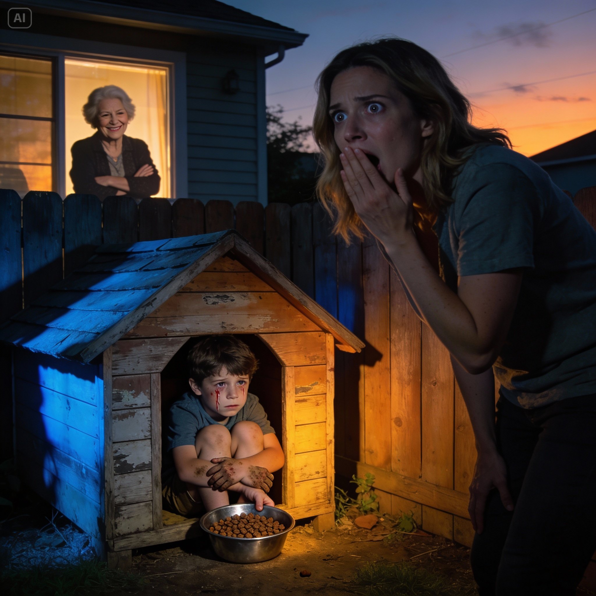 Ethan was inside the old doghouse near the fence. Not playing. Sitting. Curled in on himself. In his hands was a metal bowl filled with dry dog food. He picked at it slowly, eyes down, as if eating were something he had to earn.