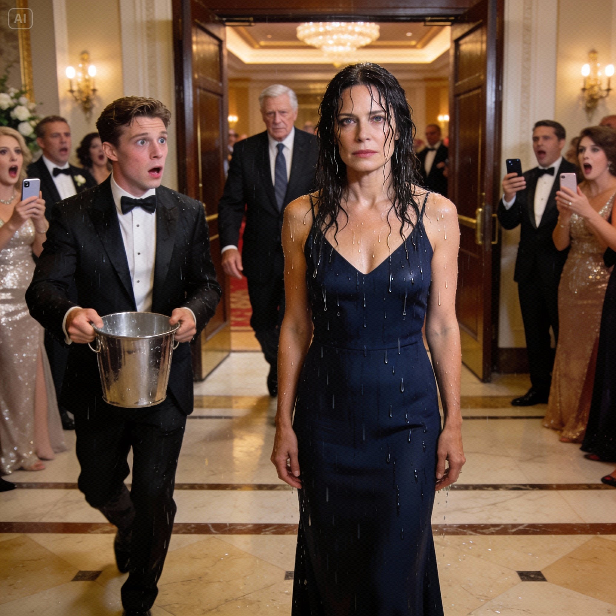 Ice water cascaded over her shoulders and down her dress. Cubes clattered to the carpet. She gasped, not dramatically—more like someone whose body has been shocked into remembering pain. Her tote hit the floor. A phone slid out and skidded under a chair.