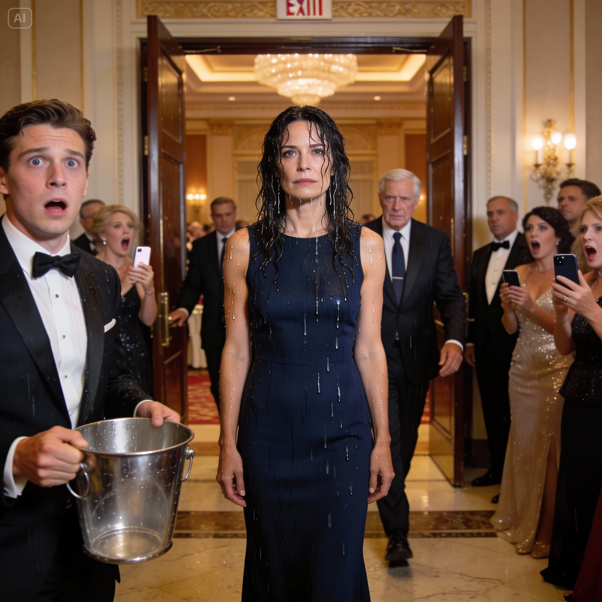 Cold water crashed over her head and shoulders, soaking her dress, her hair, her bag. Ice scattered across the carpet. A phone slid free and skidded away.