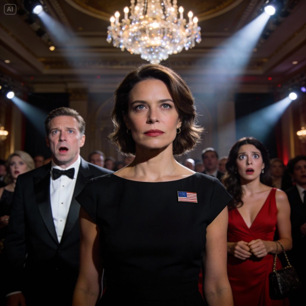 I arrived early in a plain black dress and slipped through the staff corridor. Chandeliers spilled warm light over white linen and a sapphire-lit stage. My security chief, Marcus, met me near the side entrance.