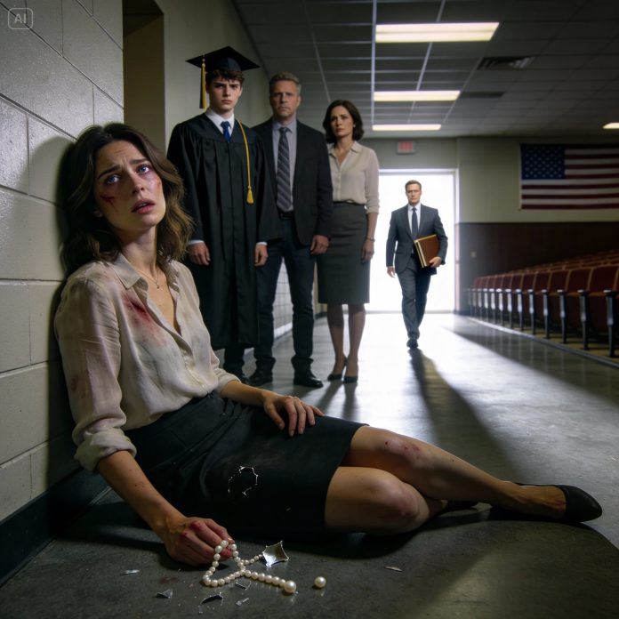 I tried to move and realized I was on a narrow couch in the auditorium’s staff room, a cheap blanket thrown over me like an afterthought. My wrists ached where someone had gripped too hard. My cheek throbbed. My throat felt raw.