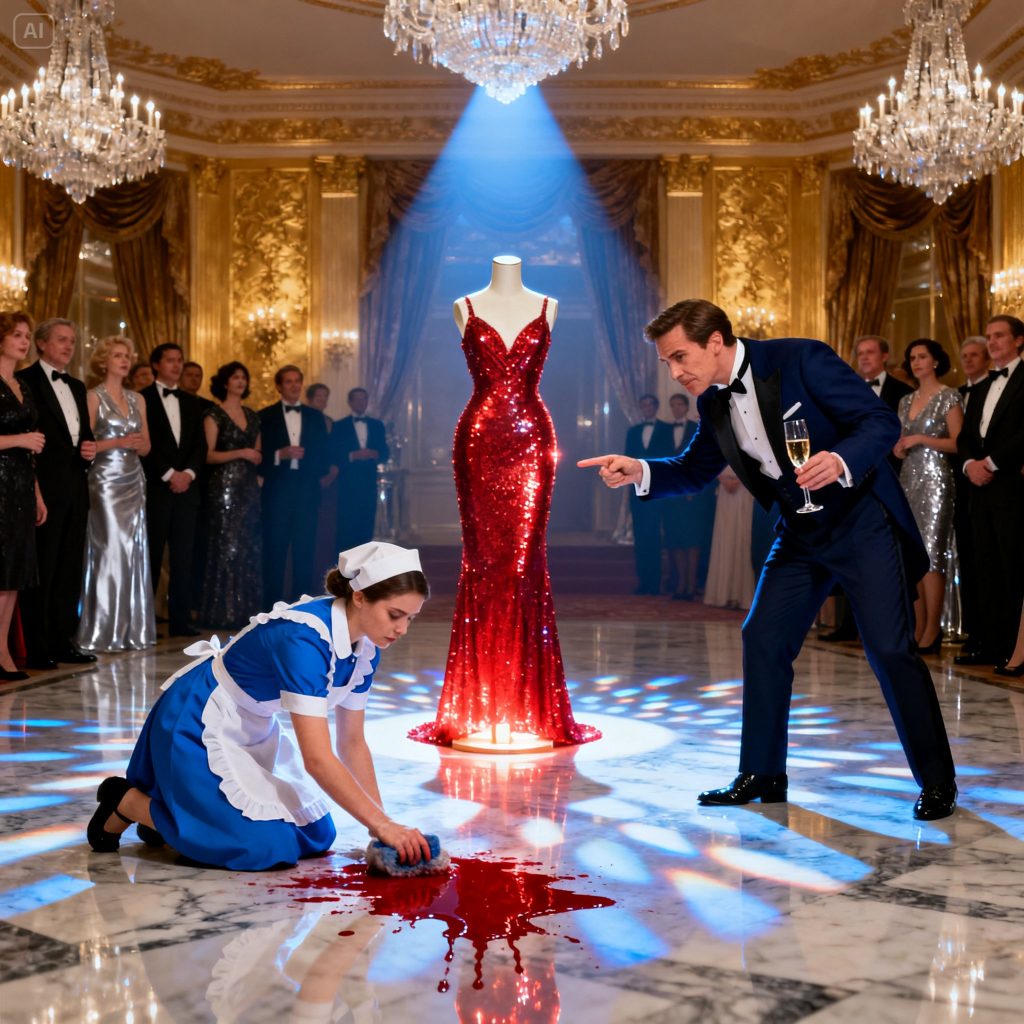 Alejandro, an impeccable figure in a tailored azure suit, halted his self-assured procession. His gaze, keen and predatory, sliced through the mirth and hushed conversations, settling directly on Clara, who stood petrified, broom clutched firmly. A fiery crimson suffused her cheeks, a raw, scorching humiliation branding her skin. A woman in shimmering golden sequins sneered, “Oh dear, the poor attendant has marred the Italian tapestry.” The remark, though not aimed at him, seemed to ignite Alejandro’s cruel amusement. He advanced slowly, his costly footwear tapping a deliberate cadence on the marble, each step amplifying Clara’s apprehension.