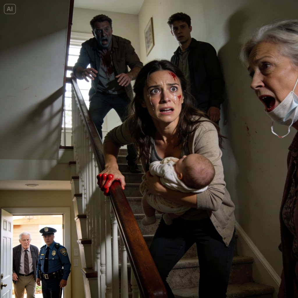 I lay sprawled on the staircase, pain screaming through my ribs, arms locked around Lily. She was crying—loud and furious. Alive.