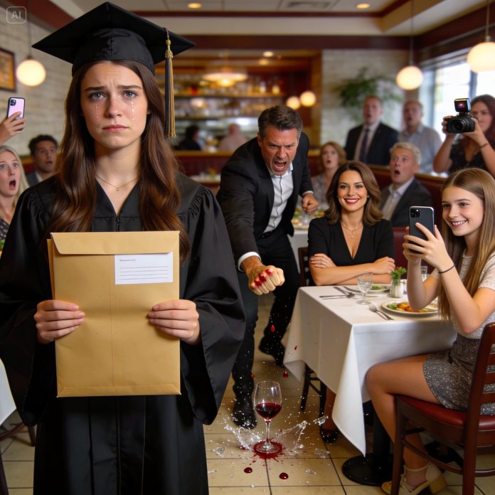 We were sitting in a crowded Italian restaurant—warm lights, clinking glasses, waiters weaving between tables with plates of pasta. My cap and gown were still in the trunk because my mom insisted we should “save the photos for later,” like my accomplishment was just another staged moment for her to control.