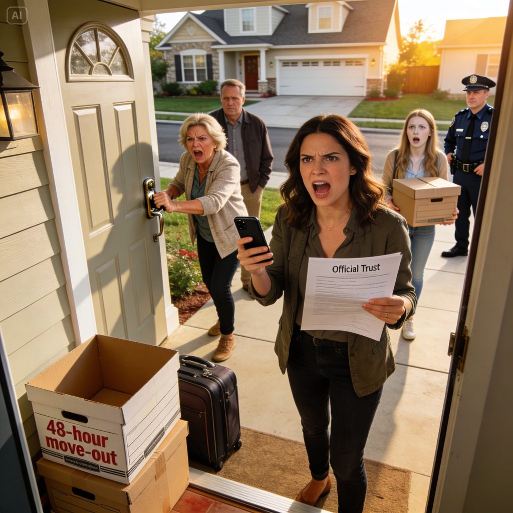 I handed the officer the trust documents on my phone. I showed him the cease-and-desist letter. I showed him the video of Lorraine trying the doorknob, pounding the door, claiming ownership.