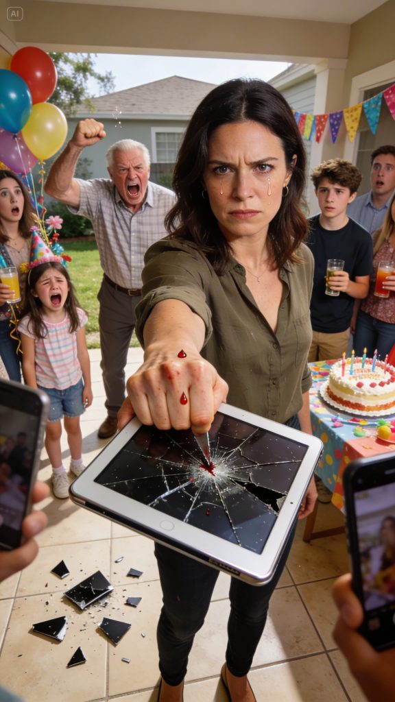 I held up the broken tablet so everyone could see the shattered screen. “This is what happened,” I said, voice steady. “A grown man broke a child’s present because he wanted to prove a point. You can all pretend it’s normal, but I’m not.”