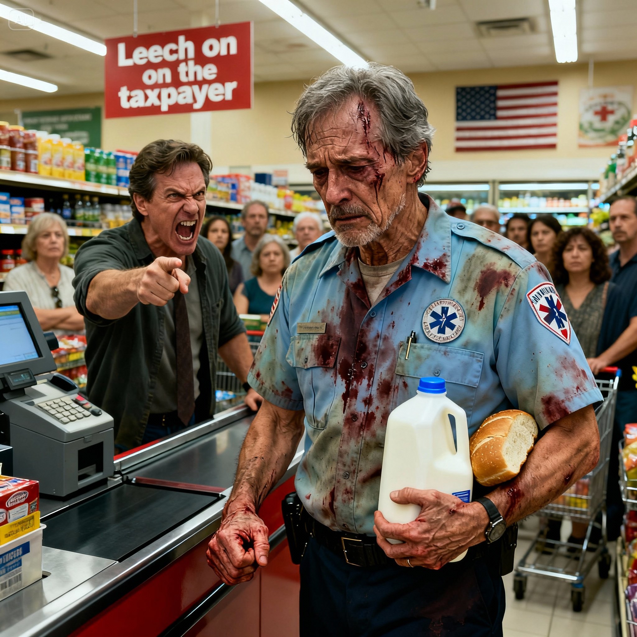 My name is Daniel Hayes, and last Tuesday I found myself in a grocery checkout line, scrubbing dried blood from under my fingernails while pretending everything was normal. It wasn’t my blood, of course. It belonged to a man I’d knelt beside twenty minutes earlier, trying to keep him alive on the pavement. I was buying milk and bread—simple things—when the man behind me sneered loud enough for the cashier to hear: “People like you are just leeches on the taxpayer.” I didn’t respond. I didn’t trust myself to. I simply paid, walked out to my truck, and waited for the shaking in my hands to settle.