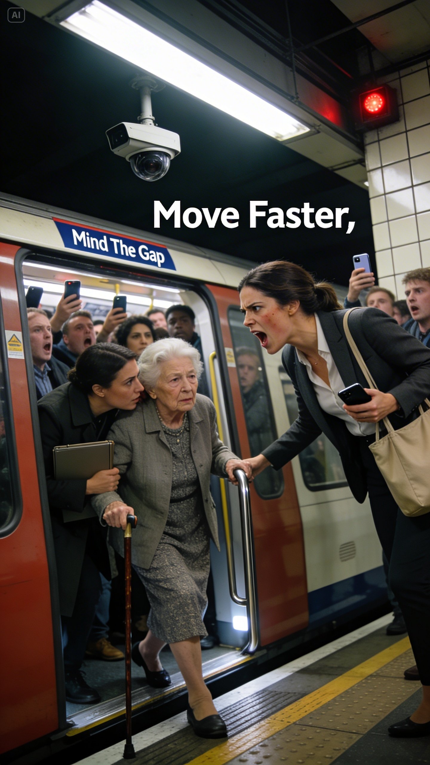 When the train finally pulled into Westminster, the doors opened and everyone surged. People poured out like water. And right at the choke point, an elderly woman stepped slowly, gripping the rail with one hand and a cane with the other. She wasn’t blocking the door on purpose. She just… moved like someone who had earned the right to move slowly.