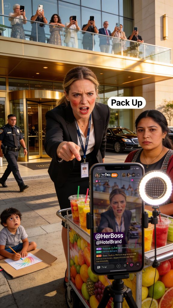 The crowd around the hotel entrance thickened, not because people suddenly needed fruit cups, but because they smelled a spectacle. Up on the rooftop, guests leaned over the glass railing with their phones out, recording like they’d paid for front-row seats.