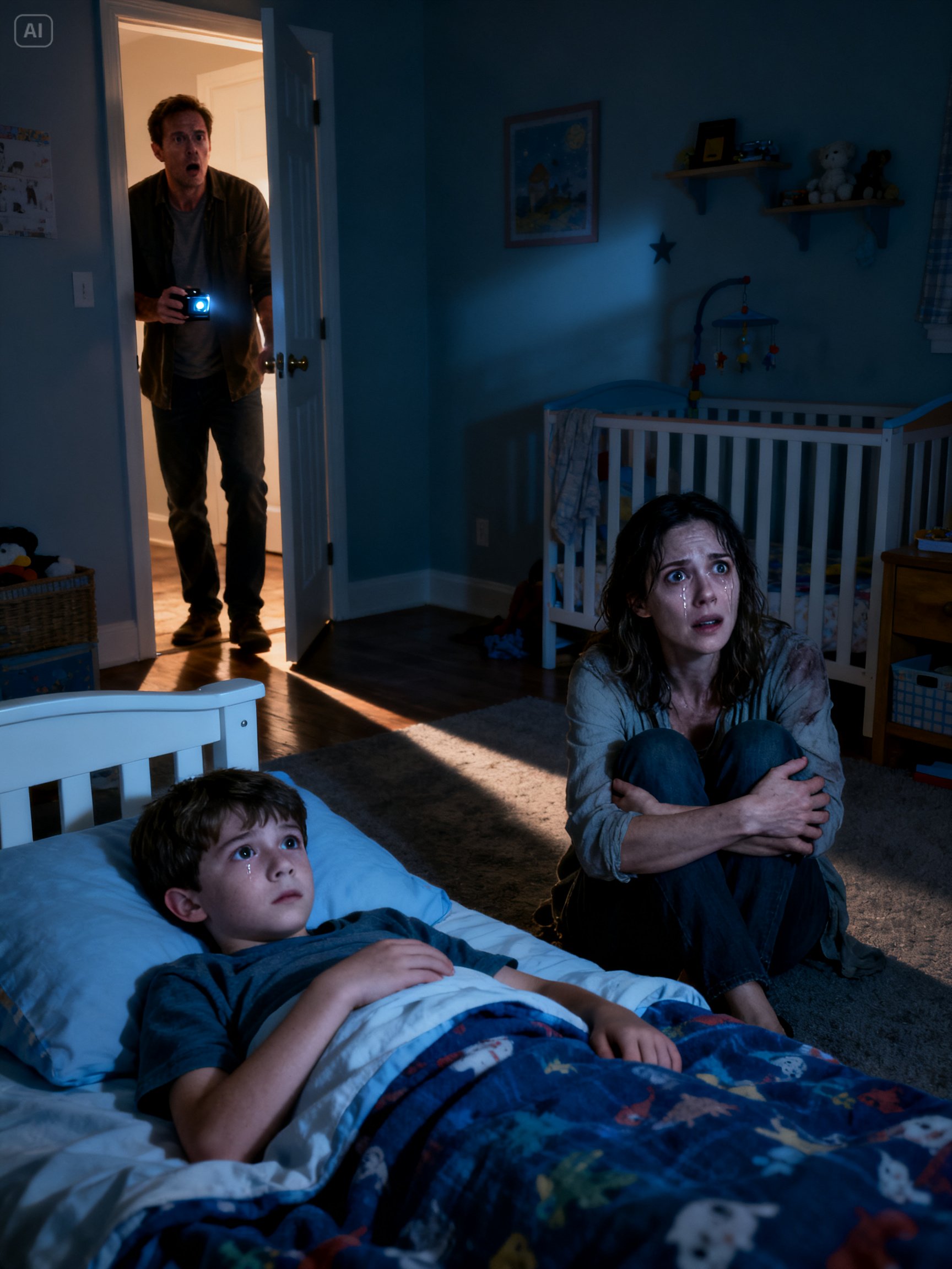 One evening, after Claire left the bedroom again, I walked into the hallway and stood by Ethan’s door. I heard her voice—soft, rapid, trembling. It wasn’t the voice of a mother comforting a child. It was a woman pleading with something only she could hear.