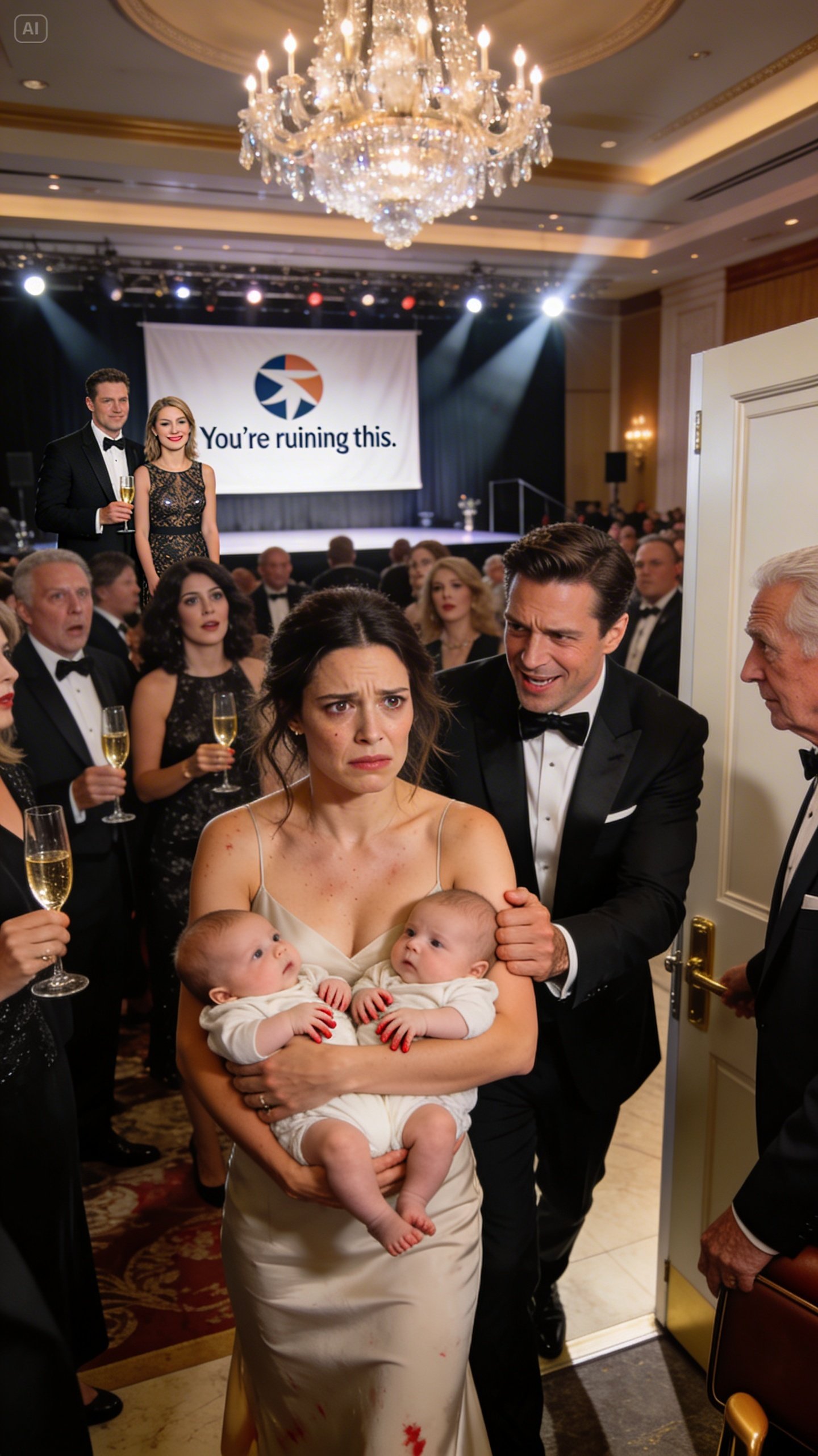 The hallway outside the ballroom smelled like flowers and hotel cleaner—sterile, expensive, indifferent. The quiet made the babies’ cries echo, like the building itself wanted to spotlight my humiliation.