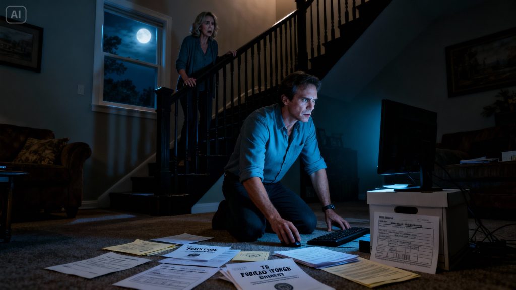 I waited ten long seconds before following him. My hands trembled as I crept down the stairs, bare feet on cool wood, trying not to make a sound. The house was dark except for a faint glow coming from the den.