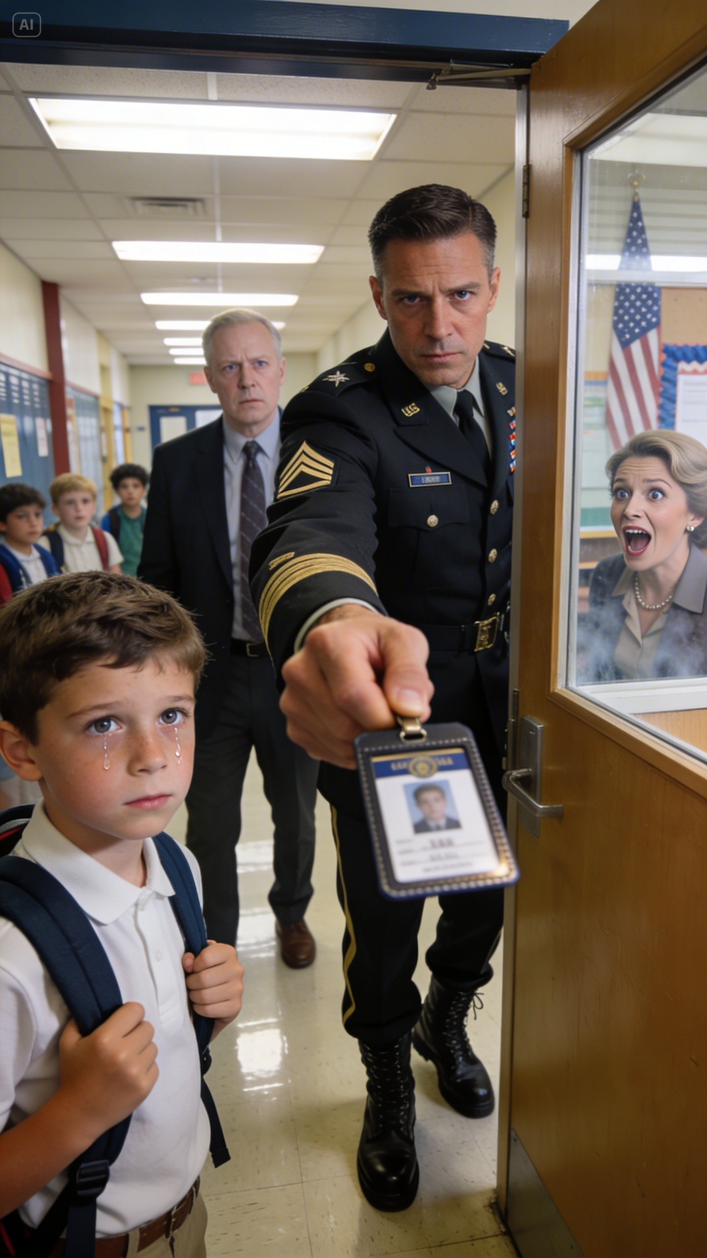 The officer didn’t look like someone playing dress-up. He looked like someone used to walking into rooms where people stopped talking the second he arrived. Tall. Controlled. Hair cut sharp. A rank I didn’t immediately recognize, but it was high enough that the principal’s usual swagger had evaporated into nervous nods.