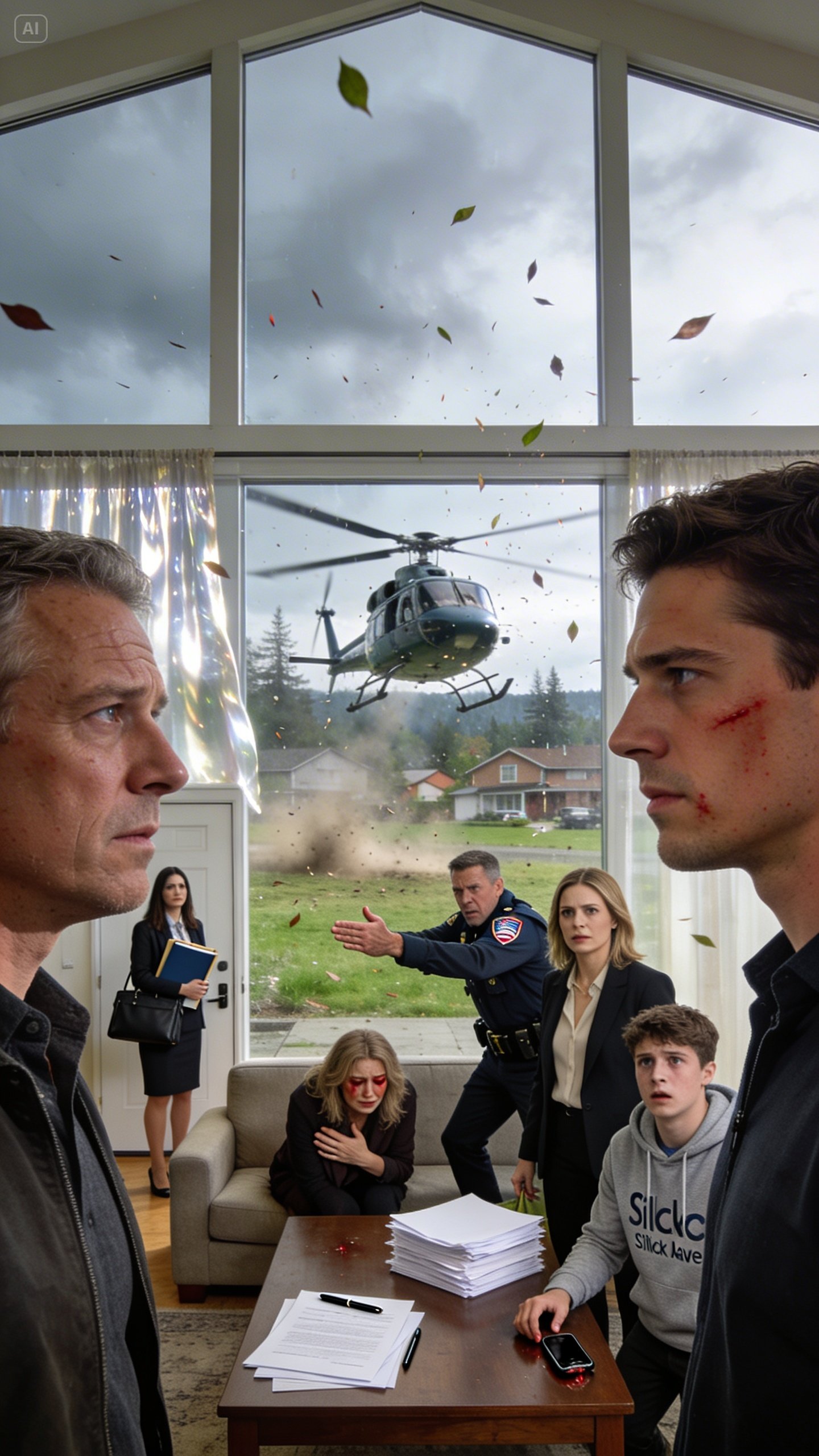 For a few seconds, nobody moved. The helicopter blades churned the air outside, sending leaves and dust skittering across the patio like the yard itself was panicking.