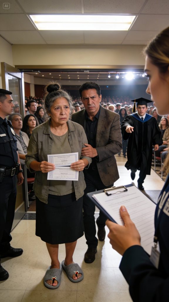My dad, Miguel, stood stiffly with his hands folded like he was waiting to be scolded. My mom, Rosa, clutched our two tickets in one hand and her phone in the other. Both of them looked like they’d rushed here without finishing their lives first. My dad’s suit jacket didn’t quite fit. My mom’s hair was still pinned in the messy bun she wore at work. And those slippers—God, those slippers—were like a neon sign that screamed they didn’t belong.