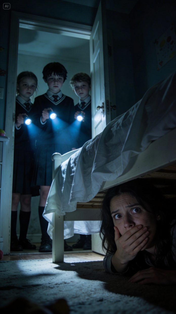 I heard Emma’s bedroom door open before I saw her feet cross the floor. She had been hiding in the closet. I knew that because I heard the soft scrape of the bifold doors and then her socks against the carpet. She walked past the bed, and for one terrible second I thought she might look down and see me. But she didn’t. She stepped into the hallway and said, quietly, “Did she really leave?”