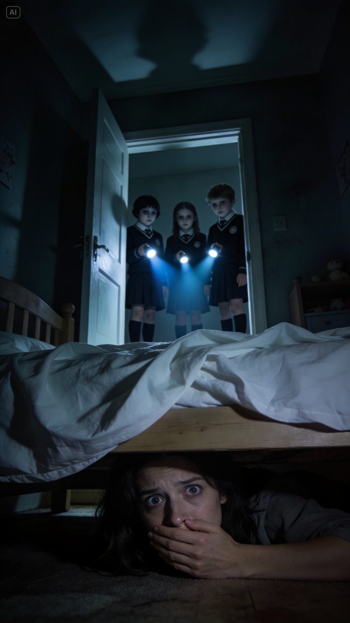 I heard the closet doors slide open before I saw Emma’s feet cross the room. That was where she had been hiding. She moved past the bed in socks, slow and careful, and for one awful second I thought she might glance down and find me there. But she didn’t. She stepped into the hallway and asked in a small voice, “Did she really go?”