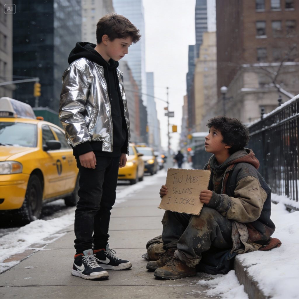 A boy sat on the sidewalk beneath a lamppost, holding a cardboard sign. His clothes were dirty, layered wrong for the weather. His hair was tangled. But the face—same jawline, same eyes, same expression I saw every morning in the mirror.