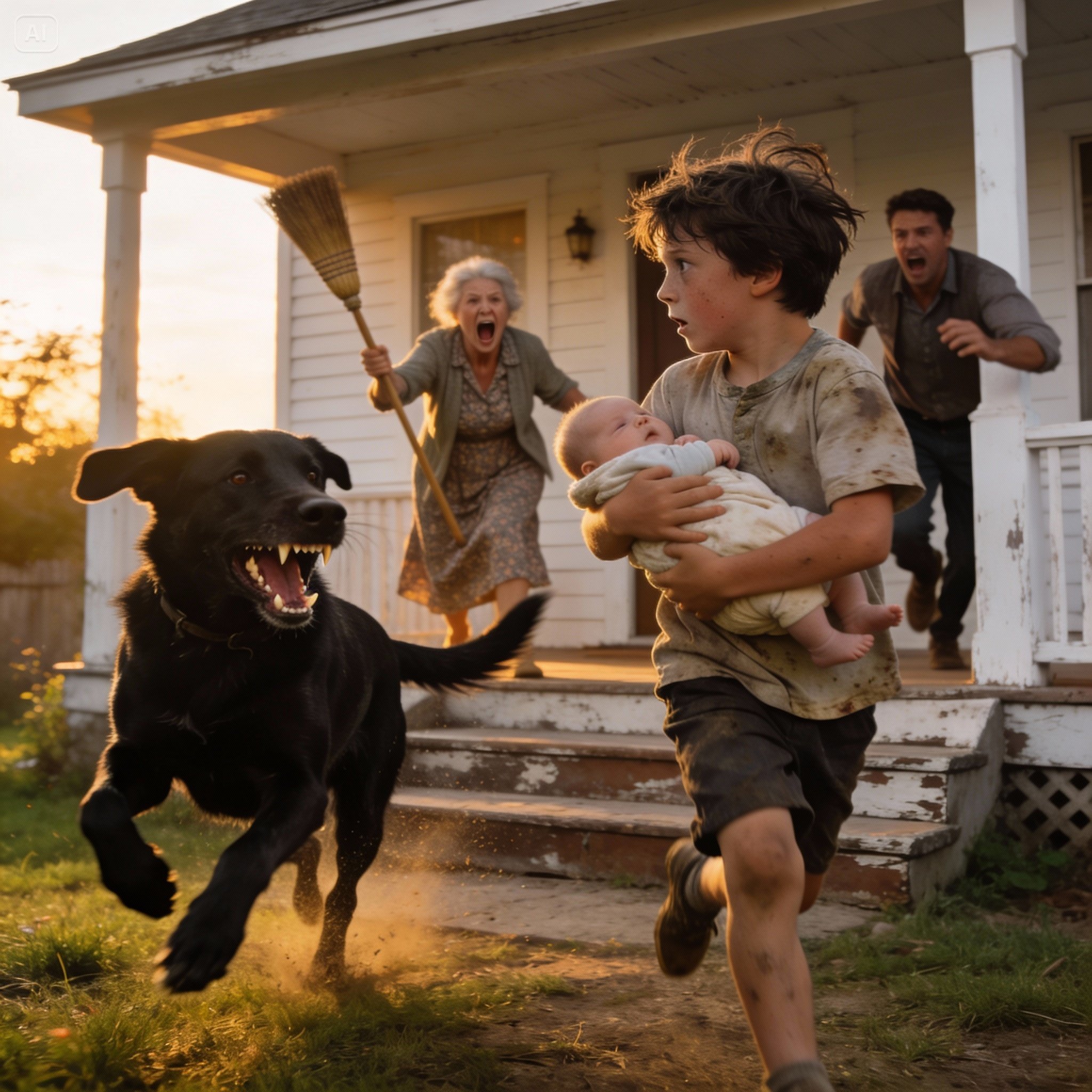 I was seven, walking across the uneven grass behind our house with my baby brother pressed against my chest. The afternoon felt ordinary—quiet, slow, harmless. Shadow, our old black dog, lay near the fence like he always did. He had never bitten anyone. Not once.