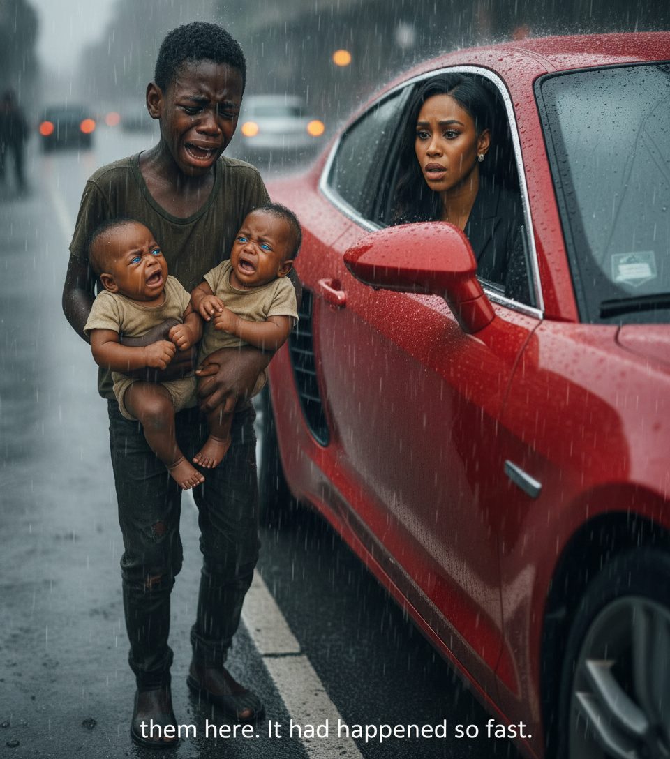 A boy stood on the divider between lanes, no older than twelve or thirteen. Barefoot. Shaking. In his arms were two babies, wrapped poorly in plastic bags, their tiny cries nearly swallowed by the rain. He wasn’t shouting. He wasn’t begging loudly. He simply stood there, absorbing the storm with his own body.
