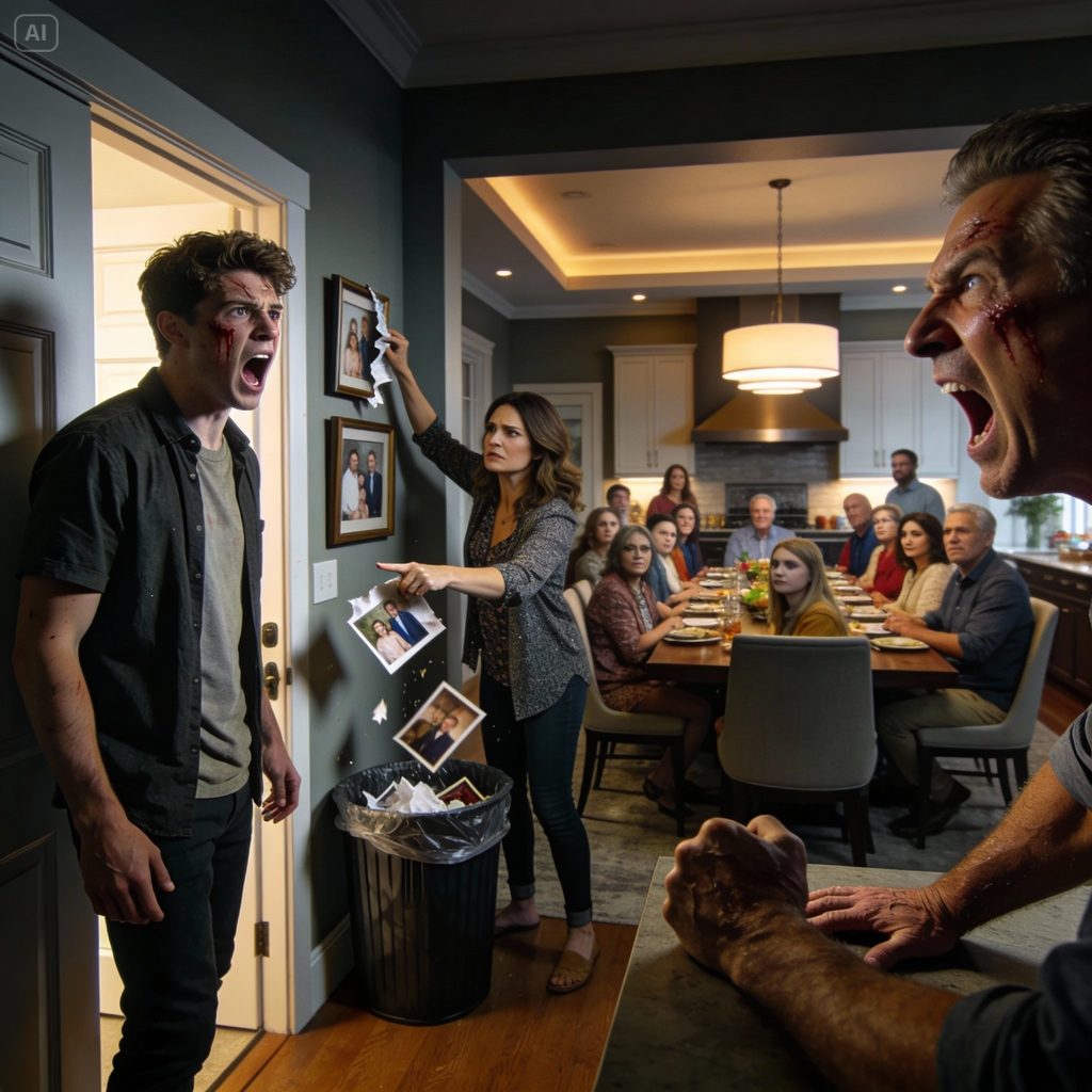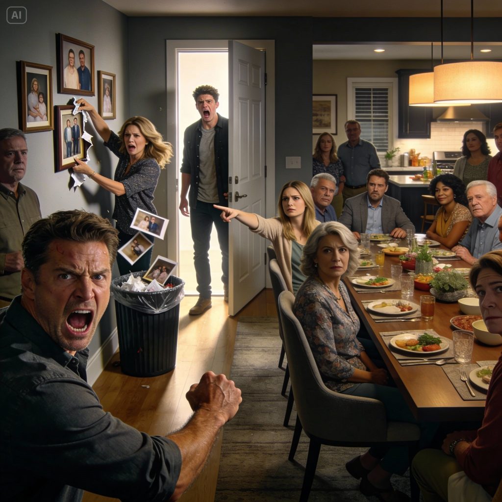 Then, without warning, my mom stood up so fast her chair scraped the floor. The room went quiet, not because she asked for attention, but because everyone sensed a storm. She walked straight to the wall, reached up, and ripped down the framed photos that had me in them—my high school graduation, the picture of me holding Madison at Disneyland when she was five, the snapshot of our family at my parents’ anniversary. Glass rattled. A nail popped out. My chest tightened like someone had grabbed my throat. She carried the frames to the trash can, dropped them in, and with one final shove, buried them under napkins and empty bottles.