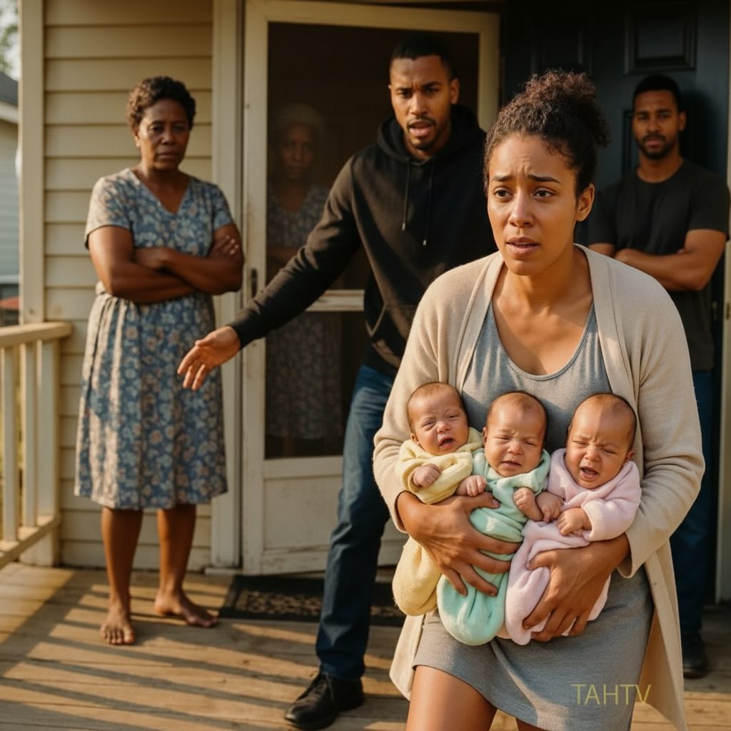 On the wooden porch of a small family house, a woman collapsed to her knees, clutching three newborn babies against her chest. Her hospital gown was thin. Her hair was damp with sweat. Blood still stained the fabric near her legs.