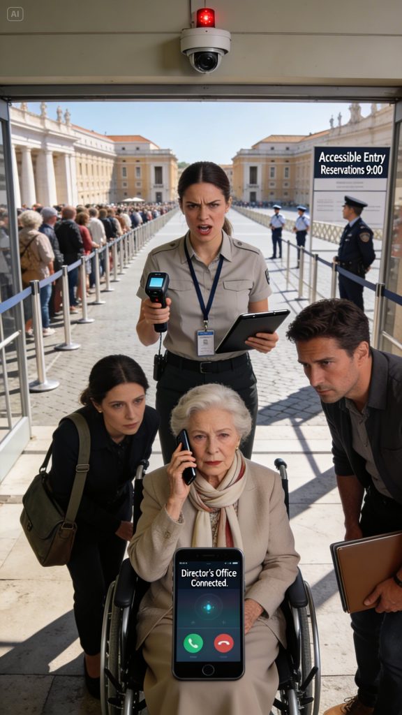 “Hello,” she said gently. “This is Dr. Eleanor Grant. I’m at the Vatican Museums accessible entrance. I’m being denied entry despite a reserved slot. Could you connect me to the director’s office?”