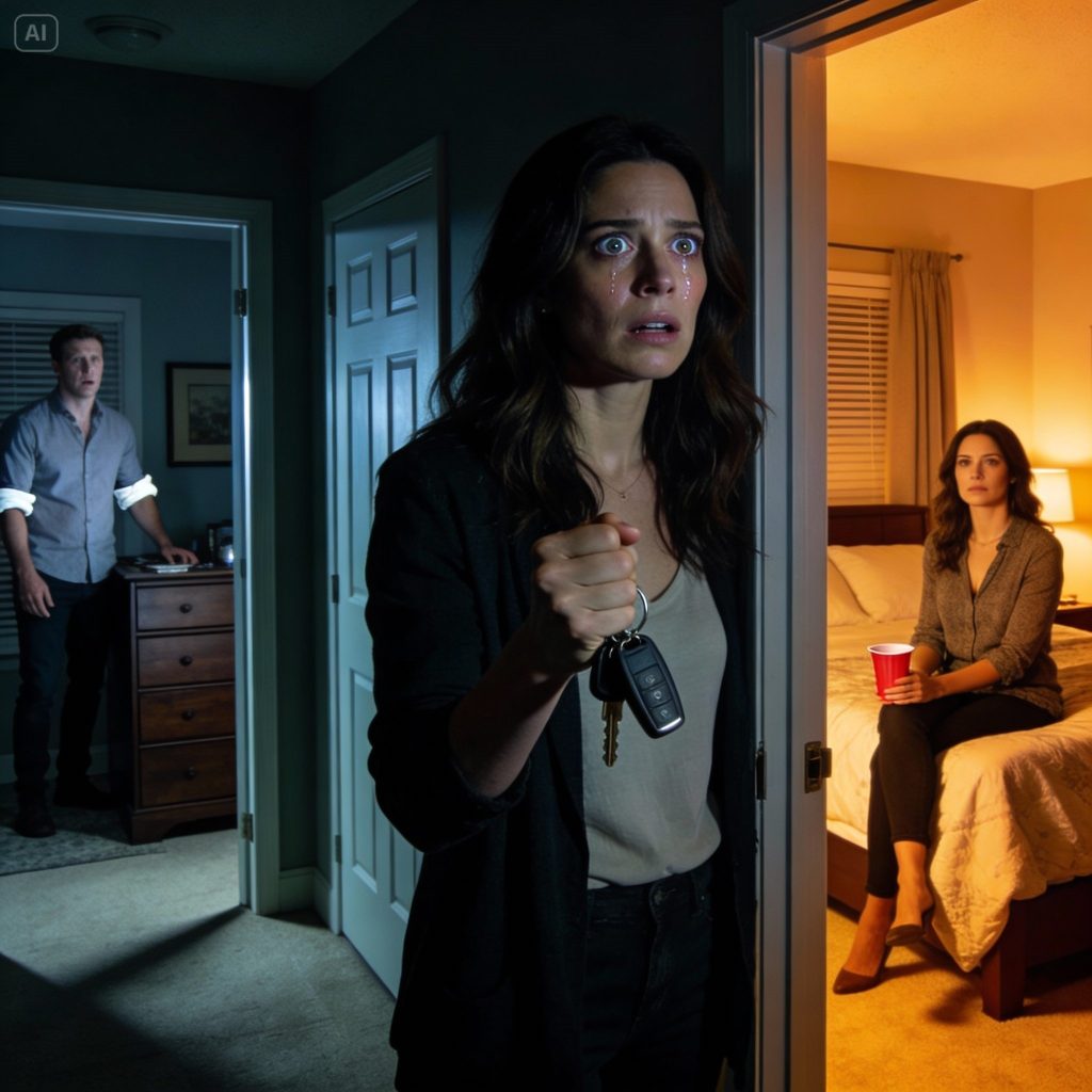 Grant stood near the dresser, shirt sleeves rolled up like he was comfortable. A woman sat at the edge of our bed, perfectly made-up, holding a small red cup in her hand like it was part of some routine.